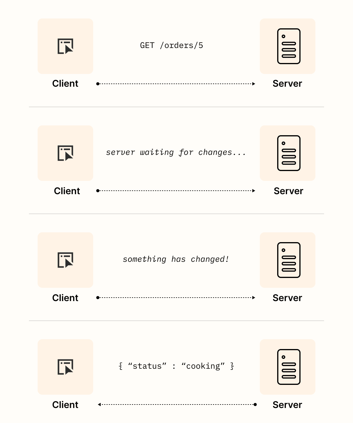 一旦订单被下达,顾客可能想要知道比萨何时准备好。我们如何使用API向他们提供更新呢?嗯,这有点困难。顾客与制作比萨无关。他们正在等待比萨店准备比萨并更新订单状态。换句话说,数据在服务器上发生变化,客户端需要知道这一点。然而,如果服务器不能发出请求,我们似乎陷入了困境!